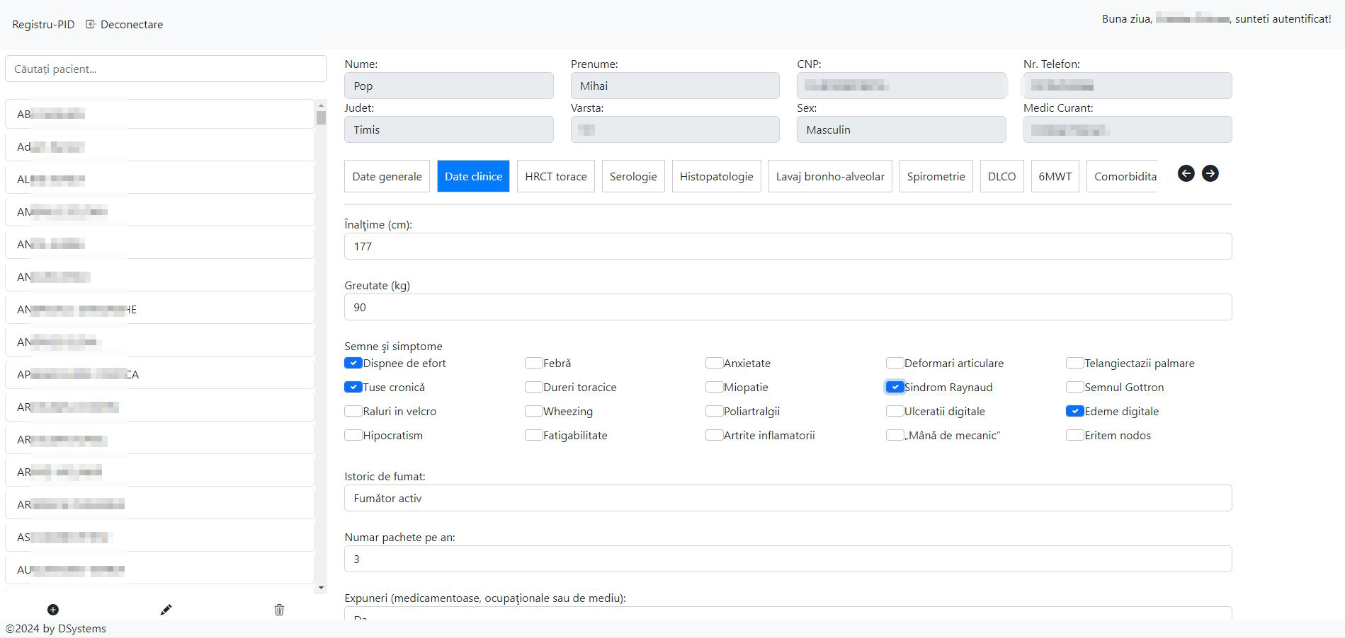 După selecția unui pacient se vor defini ecrane dedicate pentru introducerea datelor pacientului (de ex. date clinice, spirometrie, exacerbări, evoluție, etc).