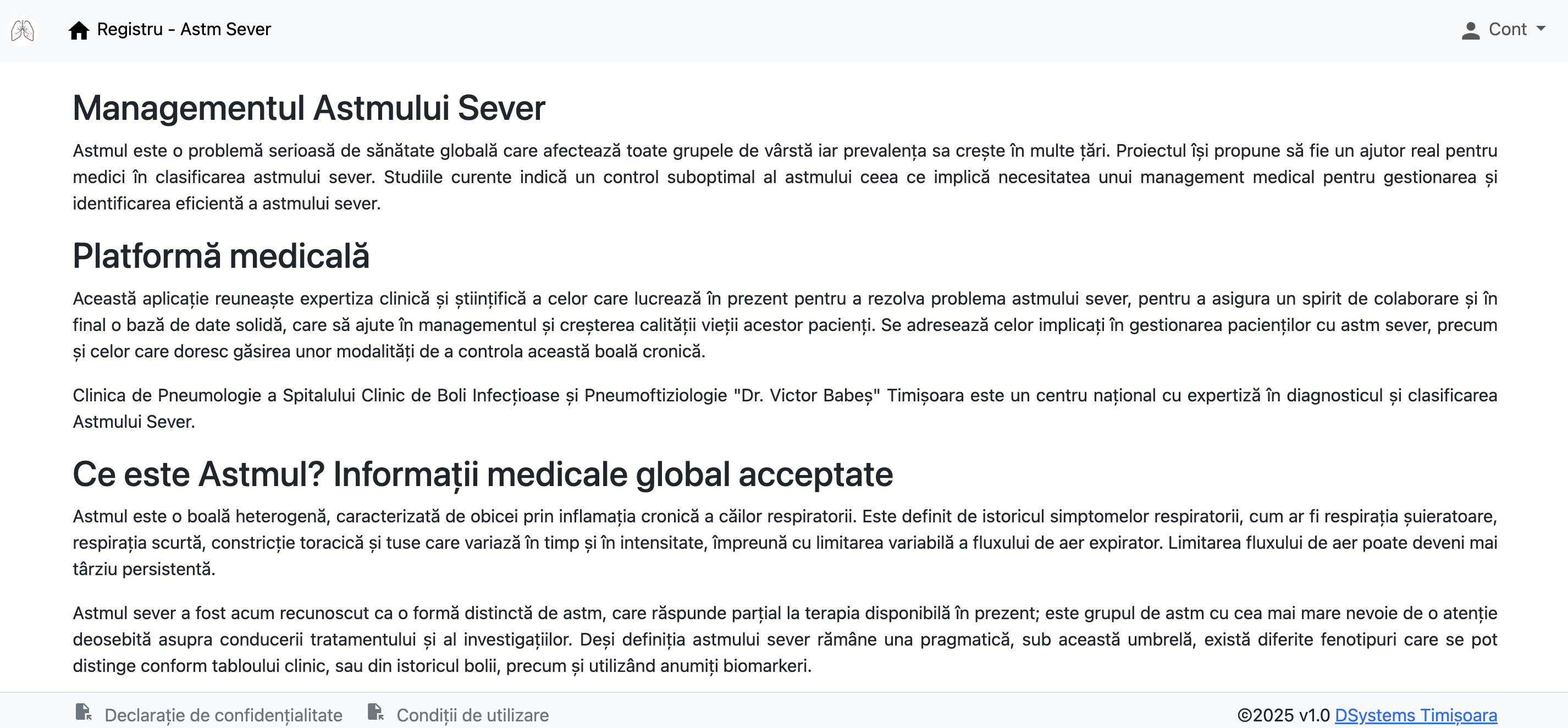 Accesul în aplicație va fi permis numai medicilor autorizați, medici care vor putea să introducă pacienții proprii în aplicație. Ședințele de analiză pentru pacienții cu Astm Sever se vor putea organiza prin accesarea directă a datelor medicale pentru pacientul analizat; în acest fel fiecare medic va putea vizualiza analizele pacientului și va putea propune un diagnostic.